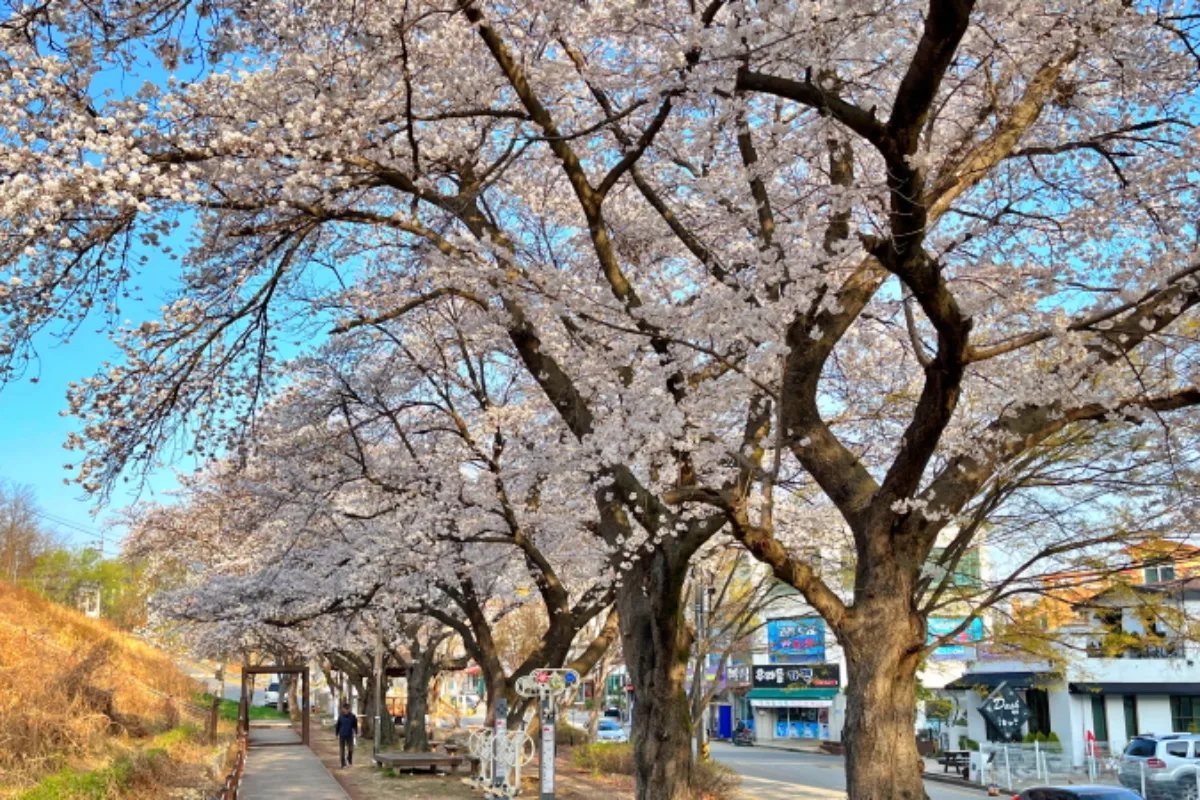 벚나무 아래에는 벤치와 쉼터가 있어 머물다 가기 좋습니다. 주로 아침 시간을 이용하면 한적한 분위기에서 산책할 수 있습니다.